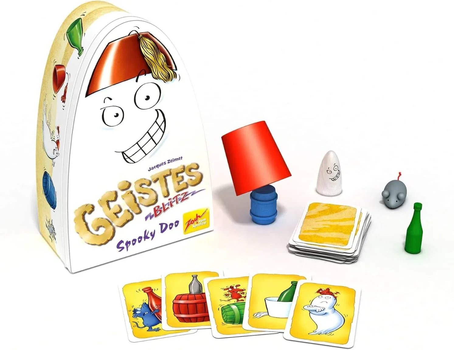白い幽霊、緑のボトル、青い樽、灰色のマウス、そして特別なフェズ帽と60枚のカードが含まれています。