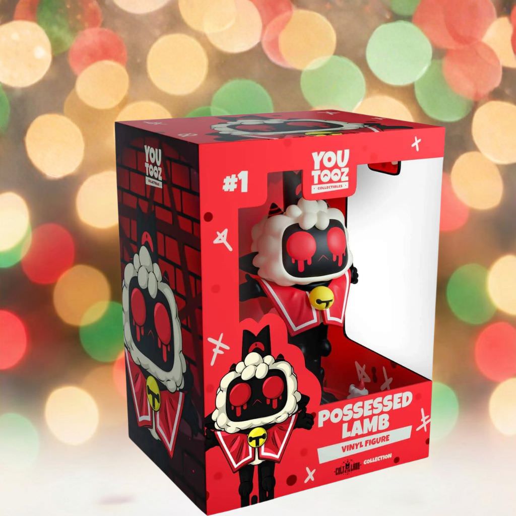 Cult of the Lamb Possessed Lamb Figure by Youtooz. This Cult of the Lamb action roguelike game figure is a collectible, 13.7cm (5.4 inches) in size, featuring red eyes, blood droplets, a black face, a cape, and a yellow bell. Highly detailed reproduction of the iconic protagonist from the popular game by Massive Monster Devolver Digital. Highly recommended for anyone looking for a true representation.